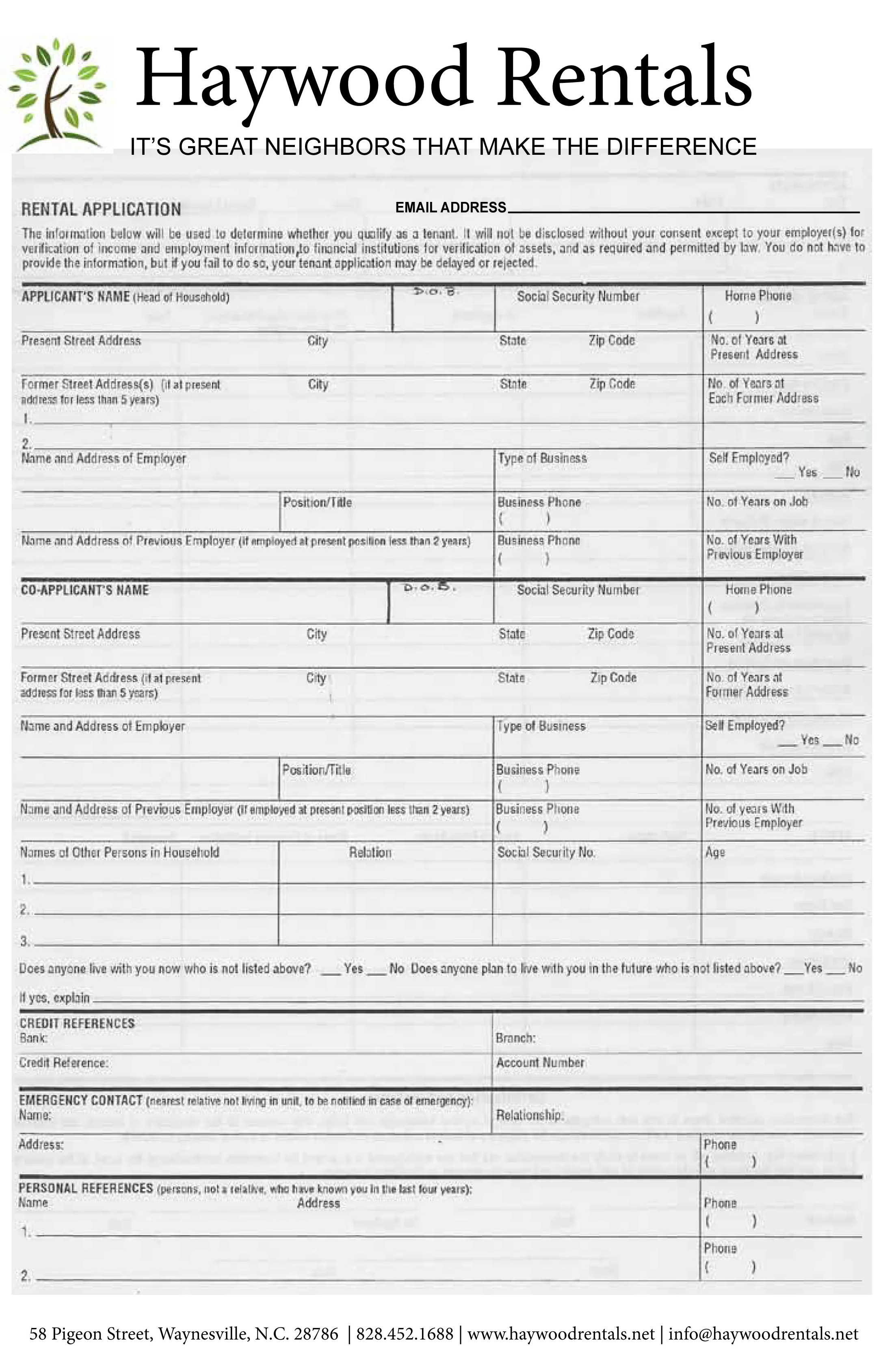 Here is an example of our application form. We provide ones to fill out in person in our office.